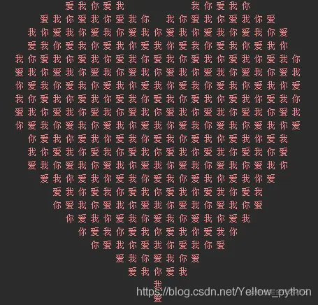 [(sleep(1e-5),print('\033[91m'+i,end='',flush=True))for i in('\n'.join(' '.join((u'我爱你'[(x-y)%3]if((x*.05)**2+(y*.1)**2-1)**3-(x*.05)**2*(y*.1)**3<=0else' ')for x inrange(-30,30,2))for y inrange(15,-15,-1)))]