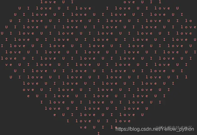 [print('\033[91m'+i,end='',flush=True)for i in('\n'.join(' '.join(('I love U '[(x-y)%9]if((x*.05)**2+(y*.1)**2-1)**3-(x*.05)**2*(y*.1)**3<=0else' ')for x inrange(-30,30))for y inrange(15,-15,-1)))]