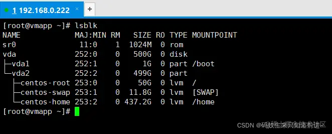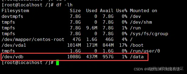 8、重启服务器后,输入命令: df -lh 查看该磁盘是否正常挂载。或者使用 lsblk