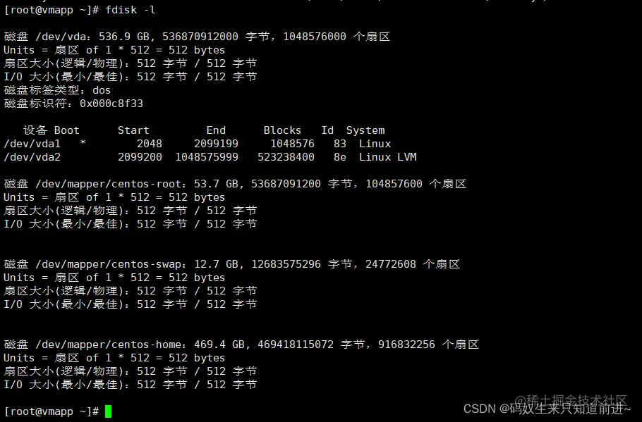 1、首先查看系统中磁盘信息,命令为:fdisk -l;