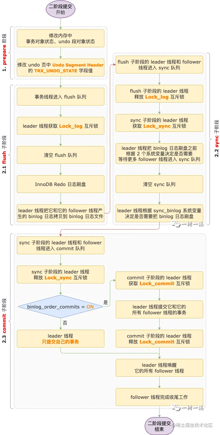 二阶段提交的核心逻辑是把多个事务的 Redo 日志合并刷盘,把多个事务的 binlog 日志合并刷盘,从而把少量数据多次 IO 变为更大数据更少 IO,最终达到提升事务提交效率的目标。