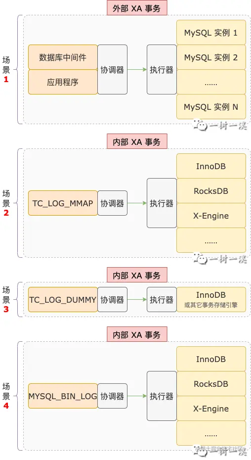 在 MySQL 中,二阶段提交有 4 种使用场景: