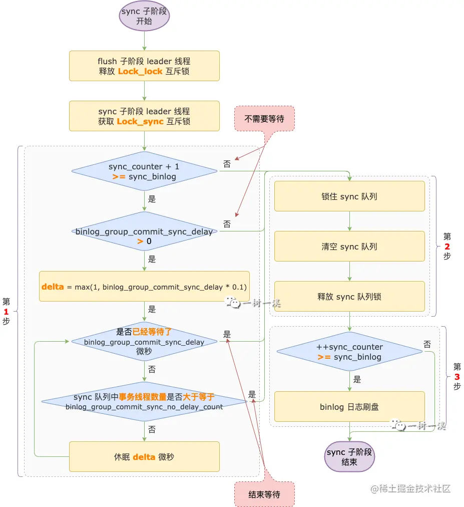 重点来了,如果某一组的 leader 线程判断 sync_counter + 1 >= sync_binlog 条件成立,那么该 leader 线程就要执行刷盘操作,刷盘之前会触发等待更多事务线程进入 sync 子阶段中的等待过程。
