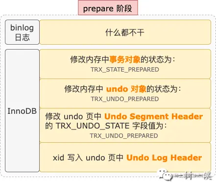 prepare 阶段,binlog 日志没有什么需要做的,InnoDB 主要做的事情就是修改事务和 undo 段的状态,以及记录 xid(分布式事务的 ID)。