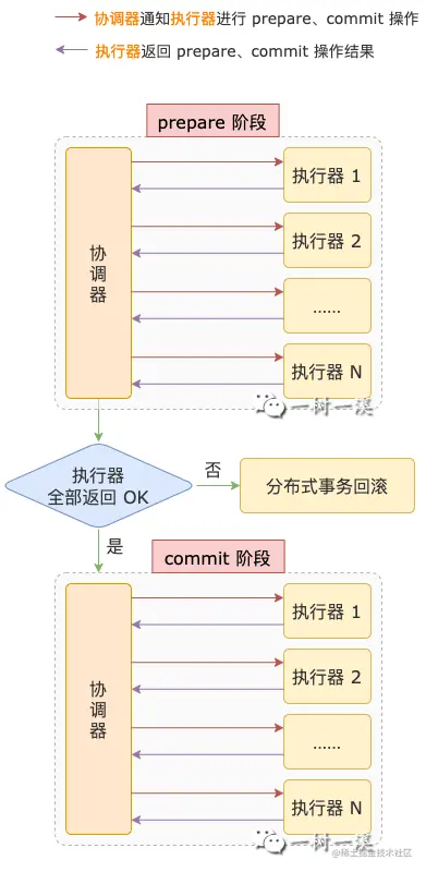 如果有任何一个执行器因为它所执行的本地事务有问题不能提交,分布式事务就不能提交,协调器会通知所有执行器进行回滚操作。