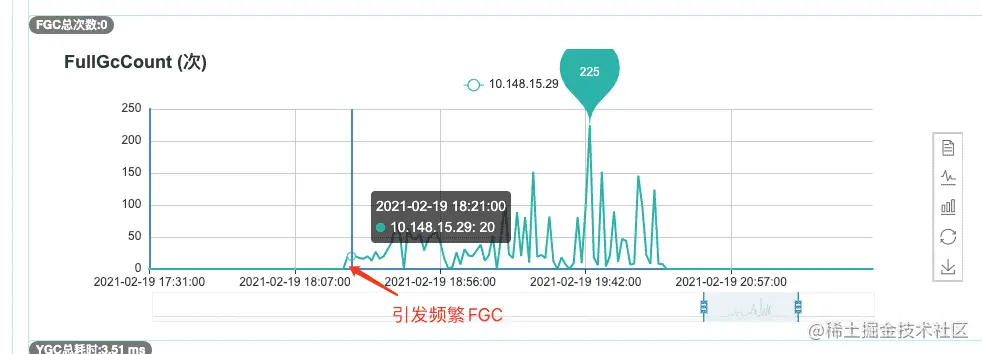 首先看JVM的状态,可以发现两个关键的异常指标。其中一个是FullGC次数。从公司内部的监控系统可以看出在18:20这个时间点某台机器的FullGC次数开始暴增。
