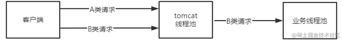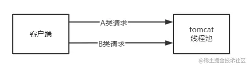 而在公司的业务场景中,A类请求的比例远远大于B类请求,这种情况是绝对不能接受的。为了保证重要业务的正常运行,需要增加另外的线程池进行线程隔离。