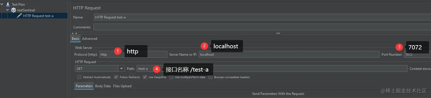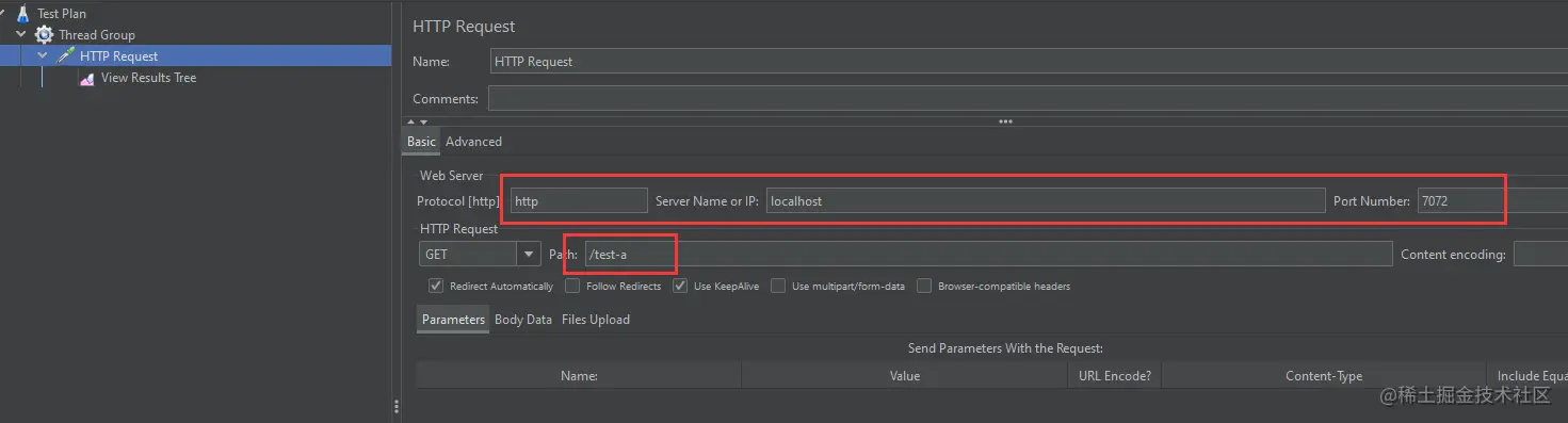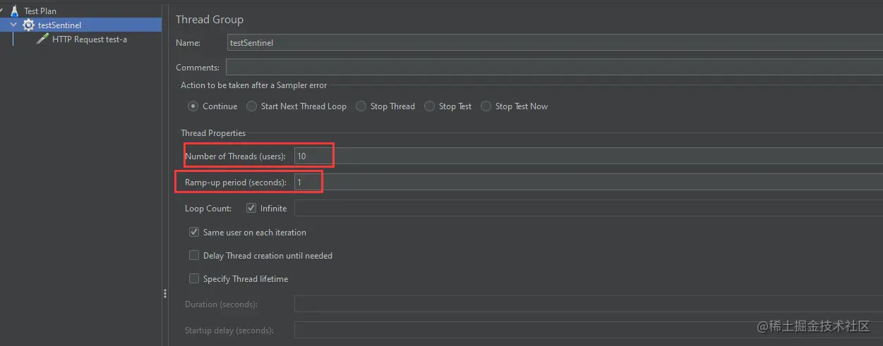 下面我们用 JMeter 来访问接口,1秒内开10个线程访问 /test-a 接口: