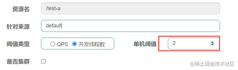 重启服务,然后来配置一下限流规则,设置并发线程数阈值为2: