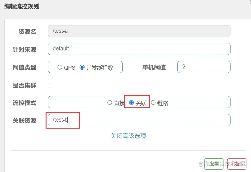 /test-a)达到限流条件(配置的阈值)时,直接进行限流; - 关联模式 :当关联的资源达到配置的