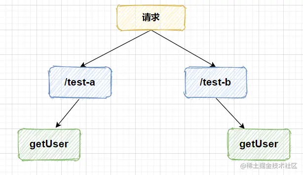 下面代码演示一下怎么 根据调用链路入口限流 。先写一个 /test-a 和 /test-b 都调用的 Sentinel 资源 getUser :