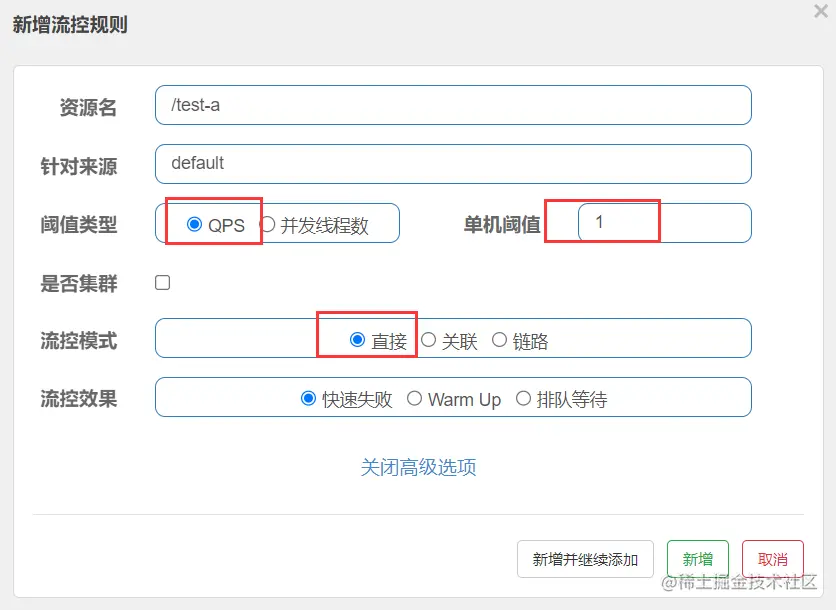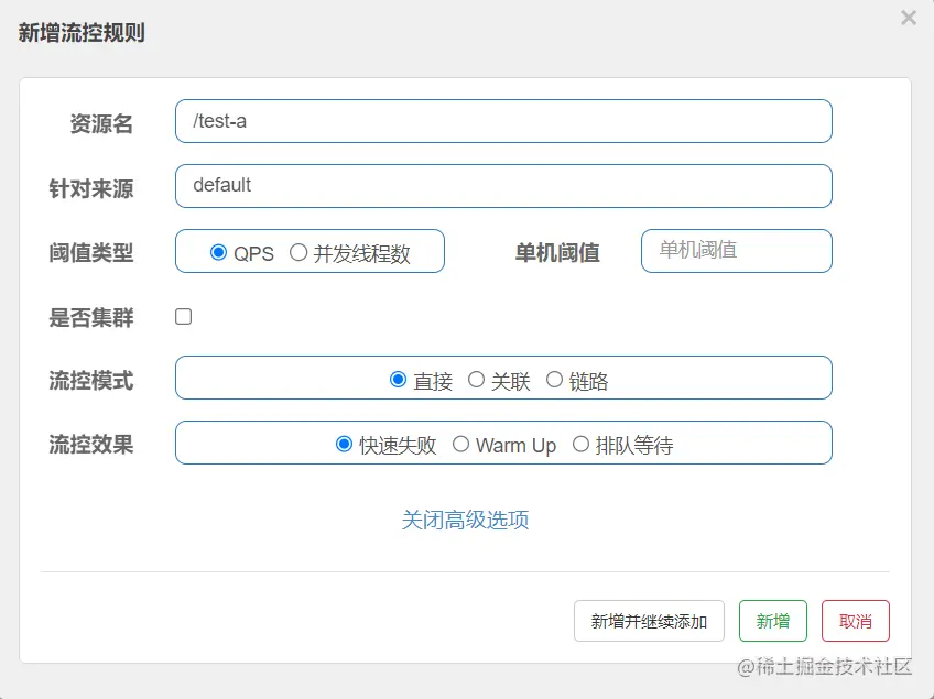 资源名:唯一名称,默认请求路径。资源是 Sentinel 的关键概念。它可以是 Java 应用程序中的任何内容,例如,由应用程序提供的服务,或由应用程序调用的其它应用提供的服务,甚至可以是一段代码。这里的/test-a接口url就是资源。针对来源:就是调用者。Sentinel 可以针对调用者进行限流,这里填写微服务名,默认default就是不区分来源。阈值类型、单机阈值:这里区分QPS和并发线程数。- QPS :Query Per Second,每秒请求的数量,当调用该请求API每秒请求的数量达到配置的