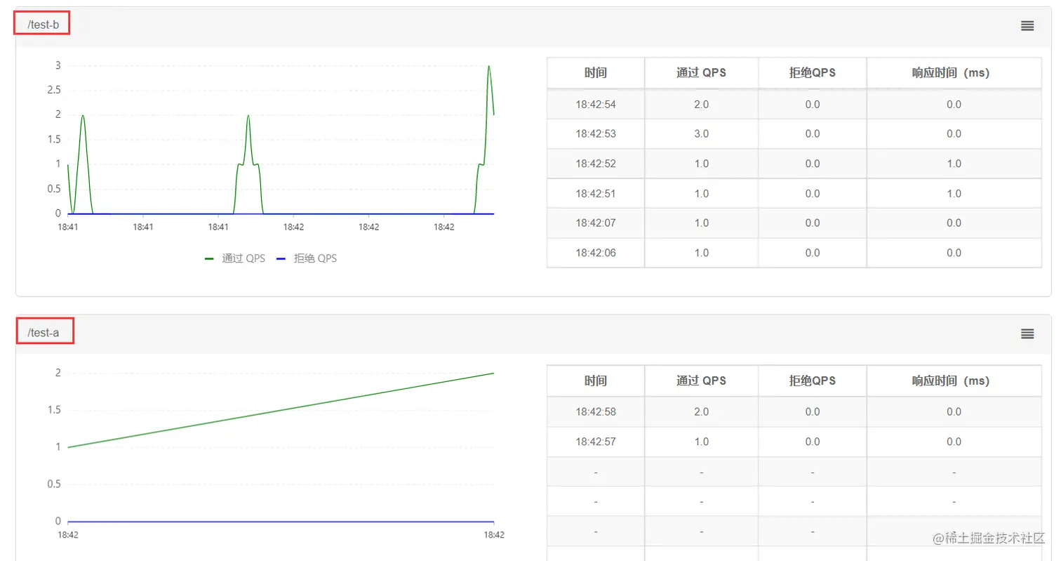 保持快速刷新调用 /test-c ,可以发现开始有通过和拒绝的 QPS ,最后就没有拒绝的了(5秒后到达阈值10后)。