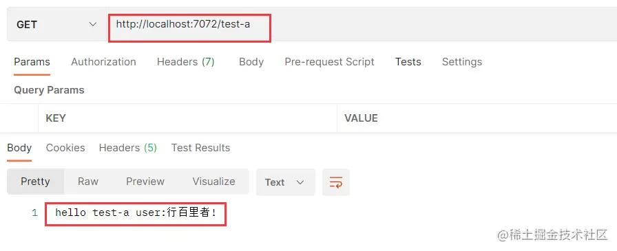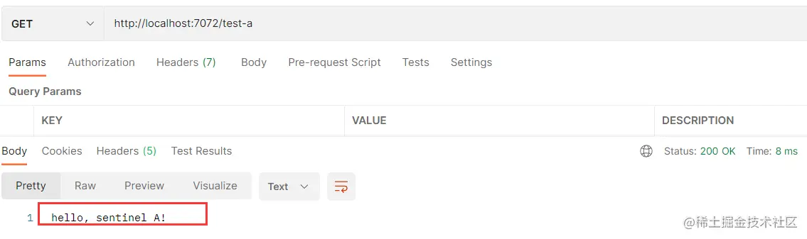 如图我配置了 QPS 的单机阈值为1,意思就是每秒只能请求1次 /test-a ,超过1次就会限流。这里 流控效果 就默认为 快速失败 。下面我们用 Postman 来调用一下,看看效果。