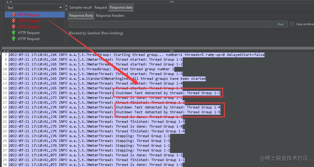 从这里可以看出,有3个请求失败了,返回 Blocked by Sentinel (flow limiting) ,只有2个请求成功,这是因为我们设置的并发线程数的阈值为2,而测试同时发出了5个线程进行请求,所以根据限流规则,其余3个线程的请求直接失败。