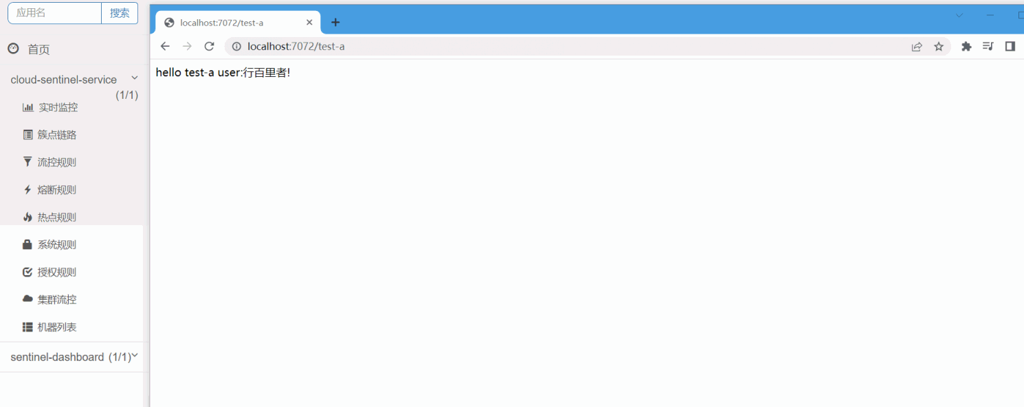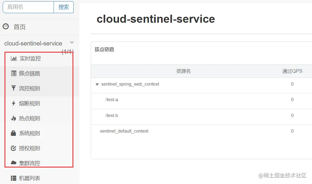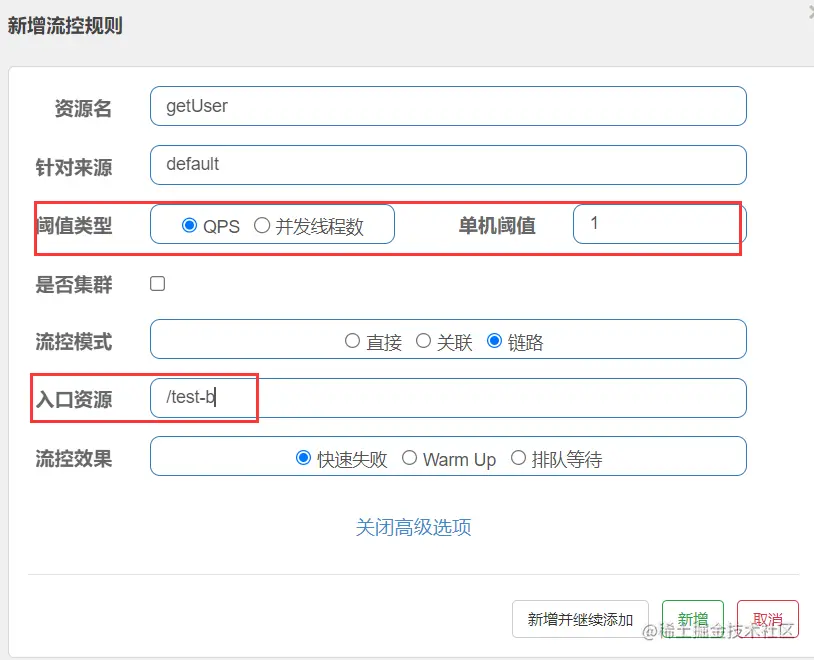 具体如何进行限流呢?这里要注意不要对 /test-a 或者 /test-b 进行限流规则的配置,要给用 @SentinelResource 注解标注的资源 getUser 进行配置限流规则,即当我们用入口资源访问被 SentinelResource 注解标注的资源方法时,当超过阈值就会被限流。