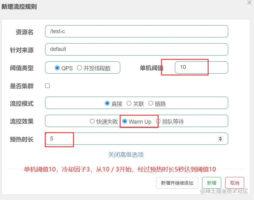 设置了单机阈值为10,预热时长5,这个流控效果就是:请求资源 /test-c 的 QPS 从单机阈值 3 (10/3)开始,经过 预热时长 5 秒达到阈值 10 。也就是说,最开始请求 /test-c 的最大 QPS 是 3 ,单机阈值开始增长,经过 5 秒的时间请求的最大 QPS 是10 。