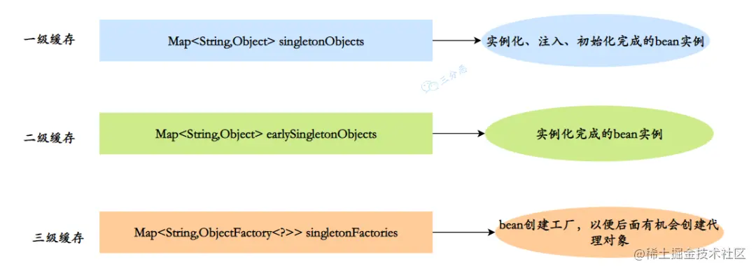 - 一级缓存 : Map<String,Object> singletonObjects,单例池,用于保存实例化、属性赋值(注入)、初始化完成的 bean 实例