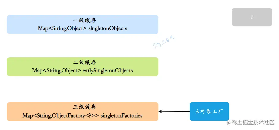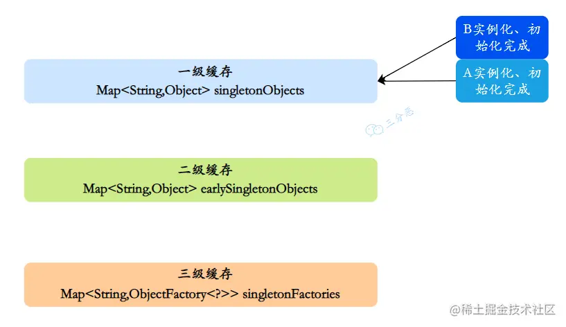同样,B注⼊属性时发现依赖A,它就会从缓存里找A对象。依次从⼀级到三级缓存查询A,从三级缓存通过对象⼯⼚拿到A,发现A虽然不太完善,但是存在,把A放⼊⼆级缓存,同时删除三级缓存中的A,此时,B已经实例化并且初始化完成,把B放入⼀级缓存。