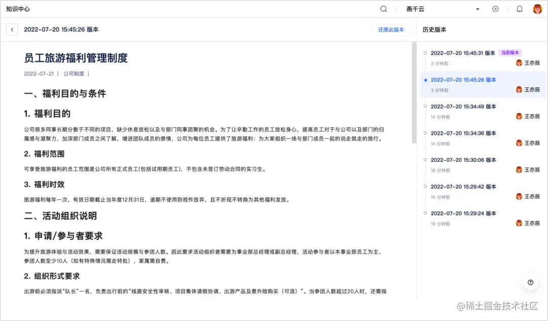随着我们所提供的单据生成知识、多人协作等知识库功能的日益完善,为了让用户在企业内部知识沉淀、协作分享时拥有更便捷、高效的体验,同时又能保证知识内容本身的正确性、稳定性,我们提供了查看、还原知识的历史版本的功能,保证知识的每次重要变更都能被记录保存、一键查阅、随时恢复。