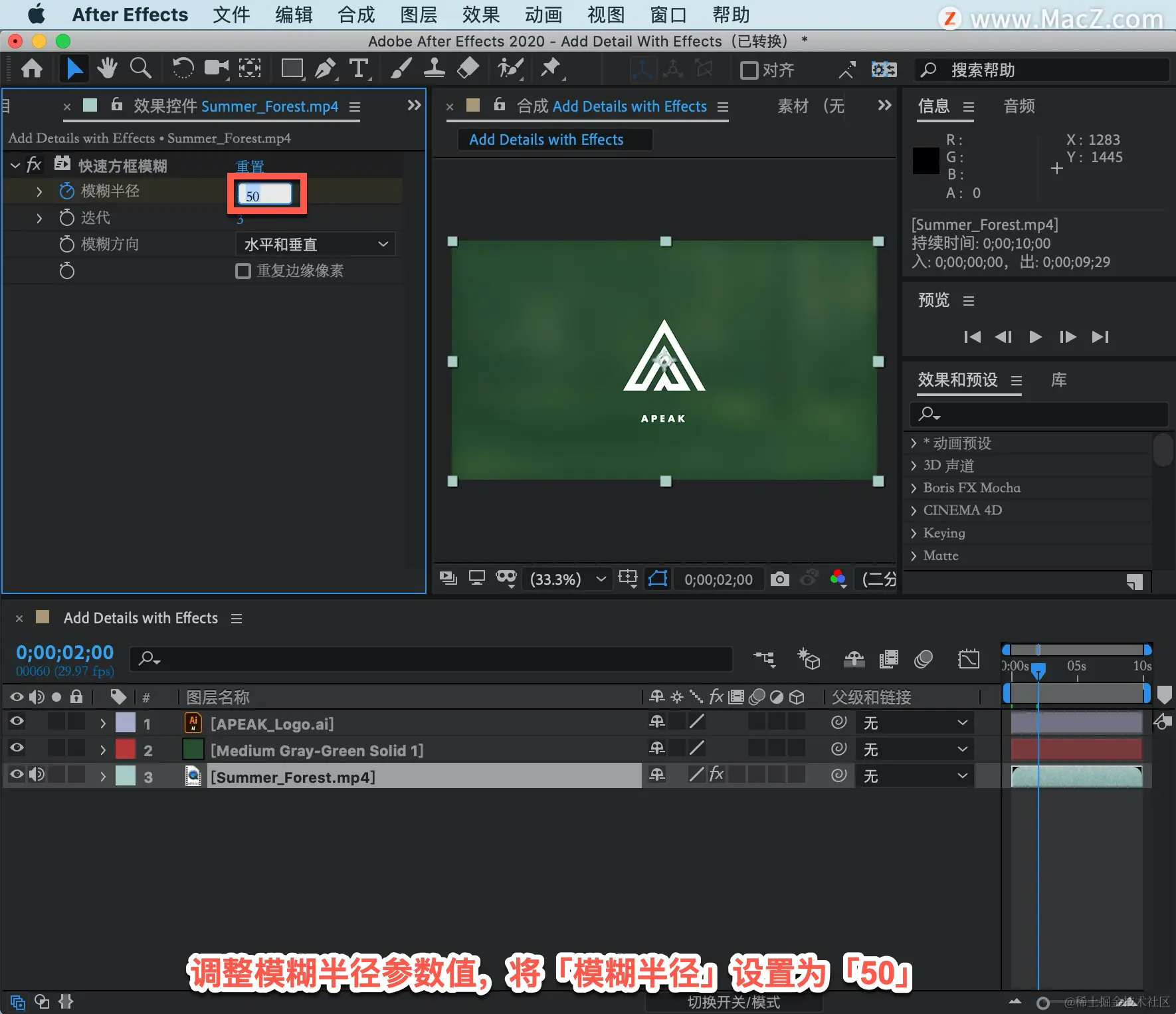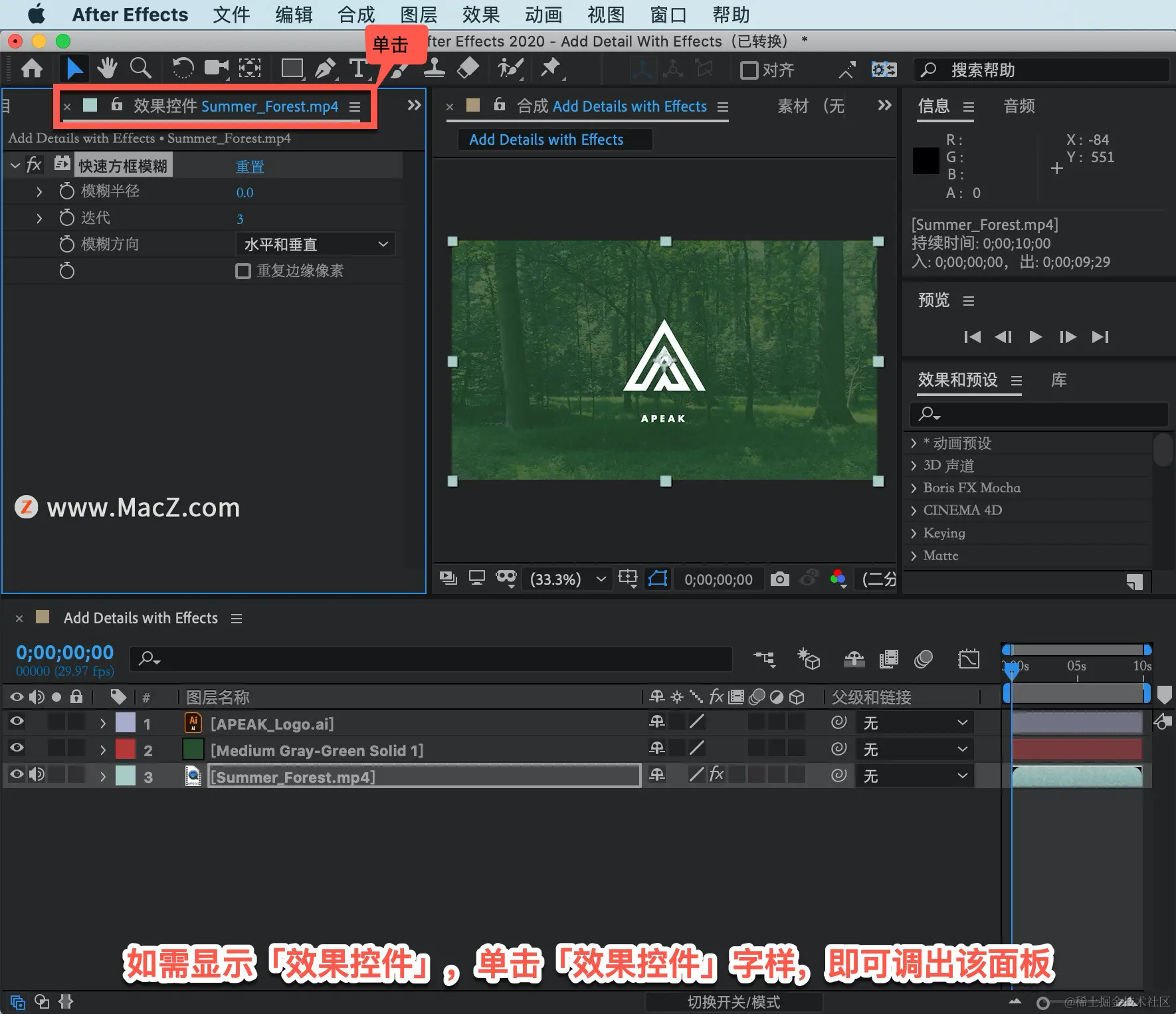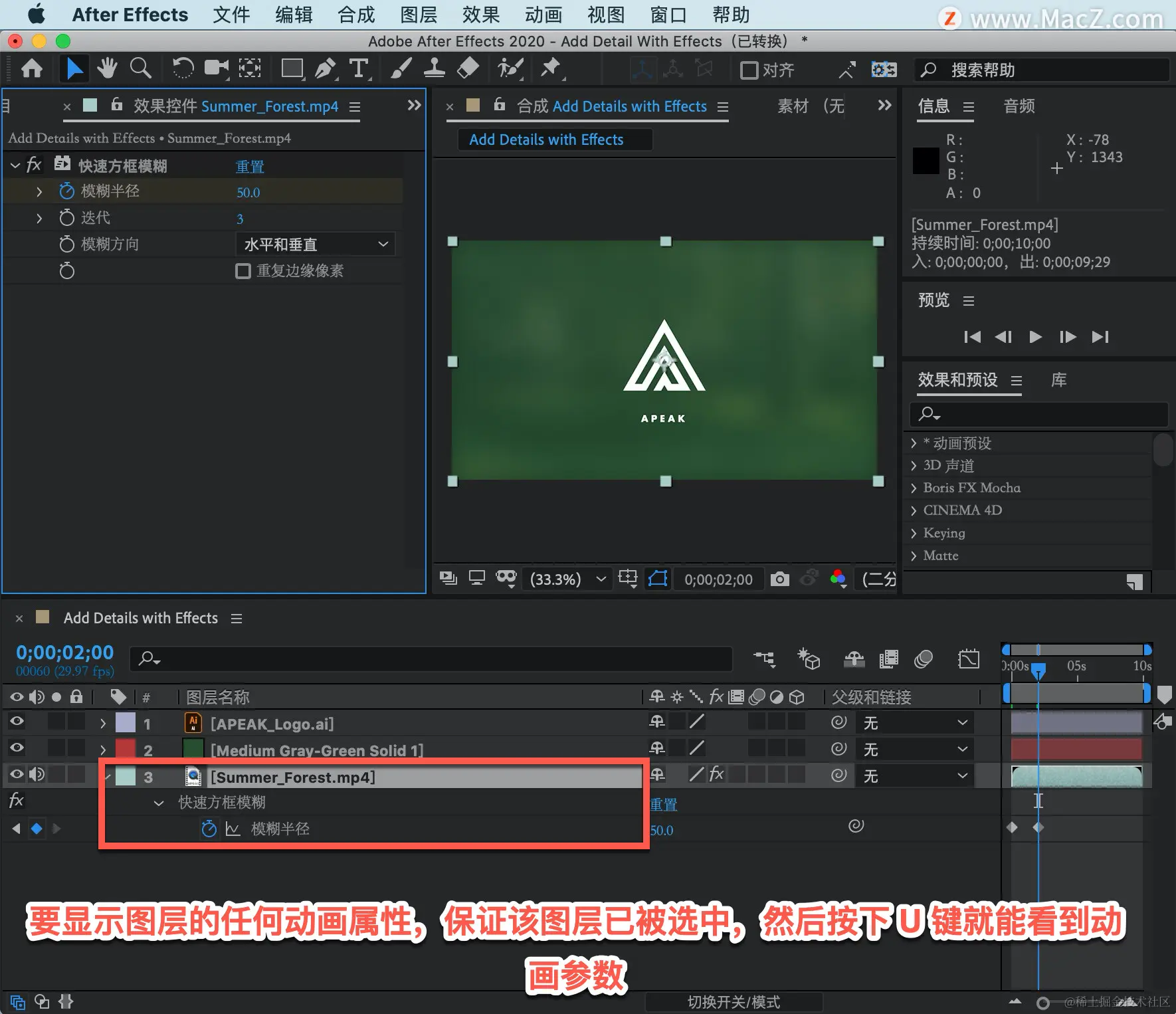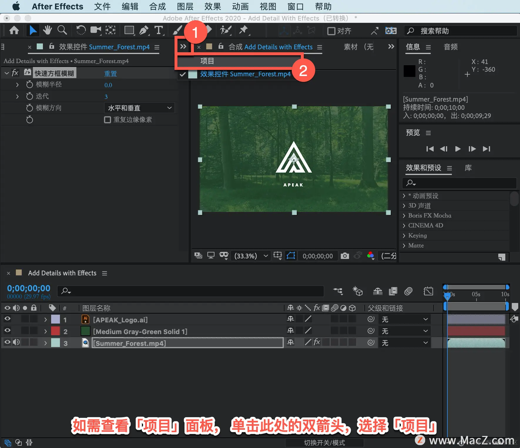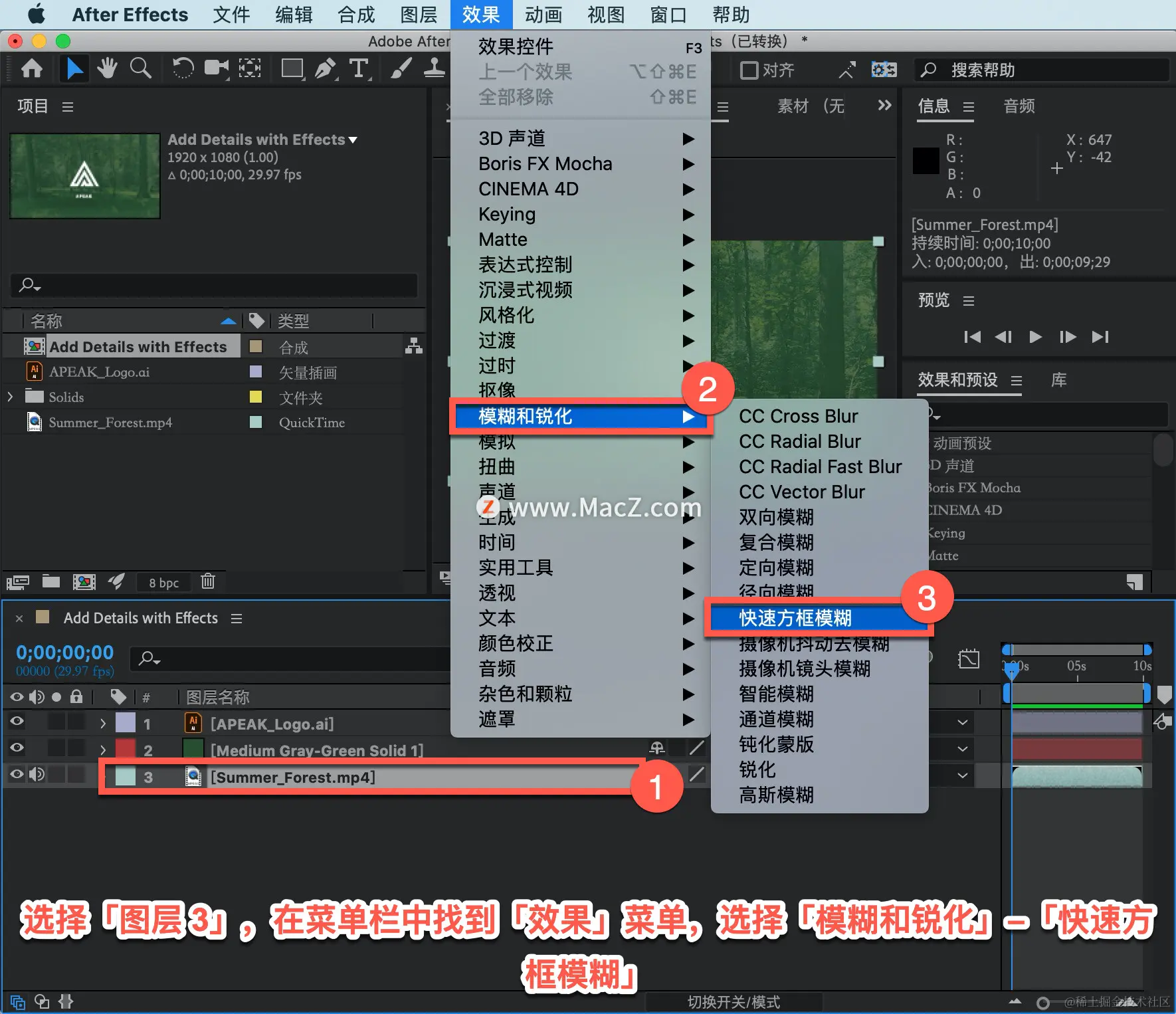 选择「图层 3」,也就是背景视频图层,应用模糊效果。在菜单栏中找到「效果」菜单,选择「模糊和锐化」-「快速方框模糊」。
