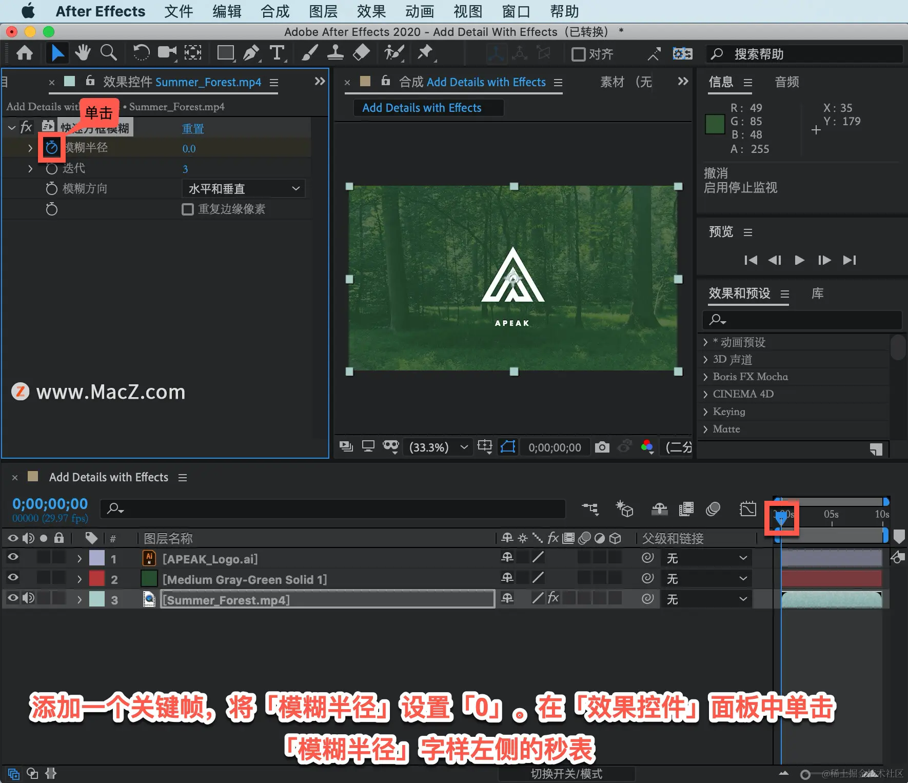 「当前时间指示器」处于 0 帧位置,添加一个关键帧,将「模糊半径」设置「0」。在「效果控件」面板中单击「模糊半径」字样左侧的秒表,完成此项设置。