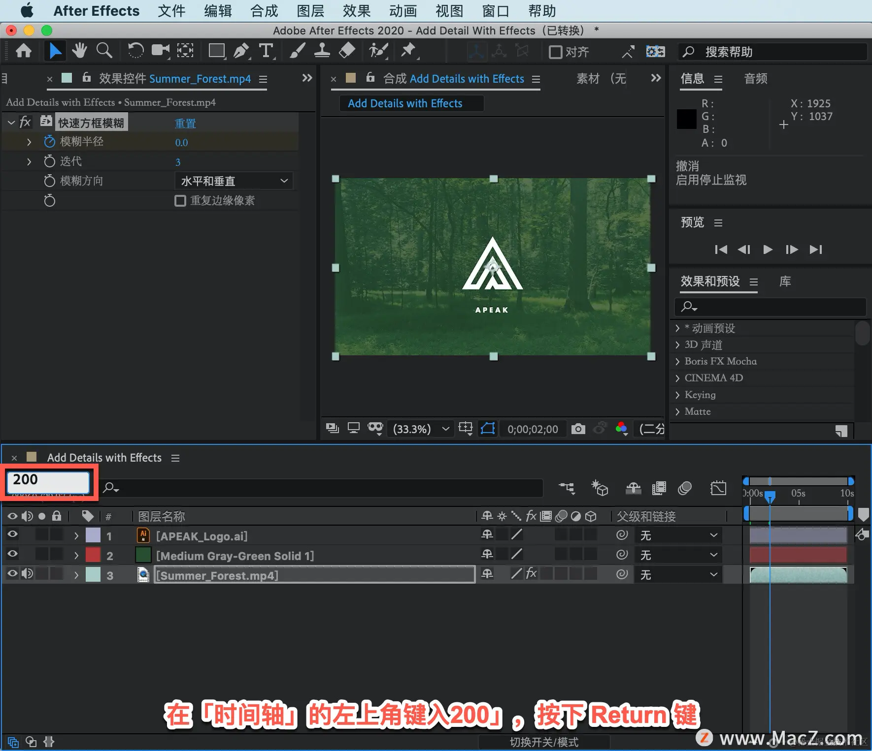 沿「时间轴」下移两秒,不确定想要达到怎样的模糊度,返回「效果控件」面板,在「时间轴」的左上角键入200」,按下 Return 键。