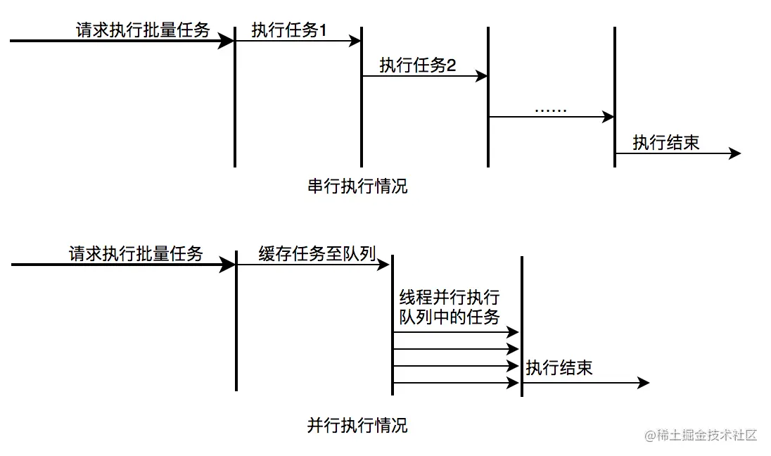 分析:这种场景需要执行大量的任务,我们也会希望任务执行的越快越好。这种情况下,也应该使用多线程策略,并行计算。但与响应速度优先的场景区别在于,这类场景任务量巨大,并不需要瞬时的完成,而是关注如何使用有限的资源,尽可能在单位时间内处理更多的任务,也就是吞吐量优先的问题。所以应该设置队列去缓冲并发任务,调整合适的corePoolSize去设置处理任务的线程数。在这里,设置的线程数过多可能还会引发线程上下文切换频繁的问题,也会降低处理任务的速度,降低吞吐量。