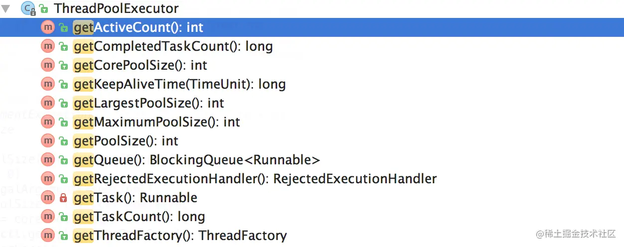用户基于JDK原生线程池ThreadPoolExecutor提供的几个public的getter方法,可以读取到当前线程池的运行状态以及参数,如下图所示: