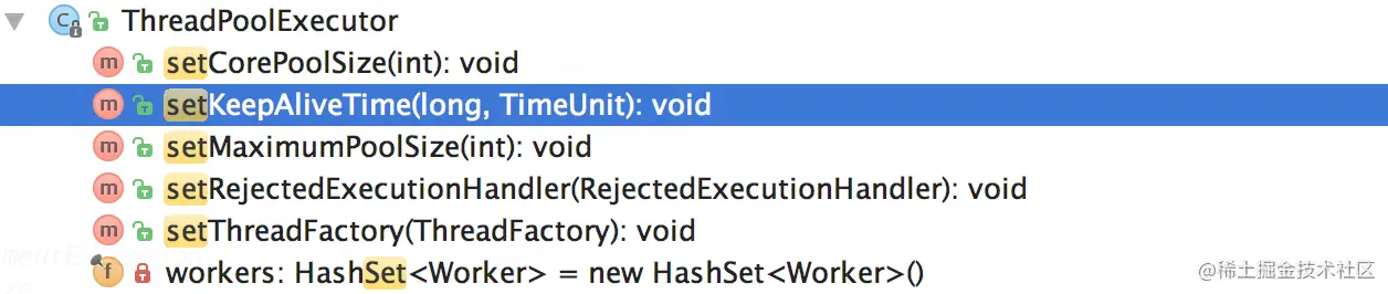 JDK原生线程池ThreadPoolExecutor提供了如下几个public的setter方法,如下图所示: