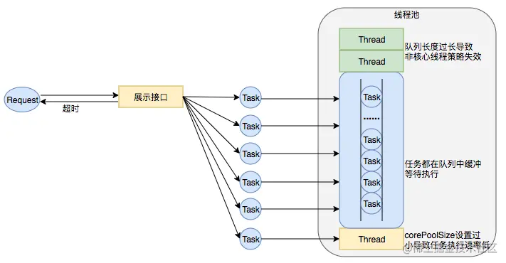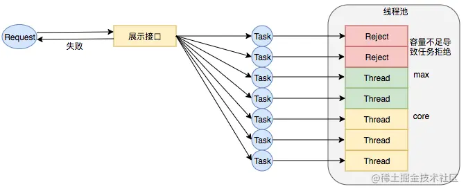 事故原因:该服务展示接口内部逻辑使用线程池做并行计算,由于没有预估好调用的流量,导致最大核心数设置偏小,大量抛出RejectedExecutionException,触发接口降级条件,示意图如下: