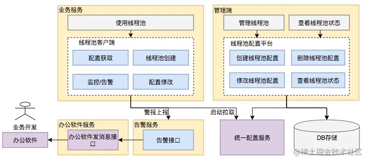 - 参数可动态修改:为了解决参数不好配,修改参数成本高等问题。在Java线程池留有高扩展性的基础上,封装线程池,允许线程池监听同步外部的消息,根据消息进行修改配置。将线程池的配置放置在平台侧,允许开发同学简单的查看、修改线程池配置。