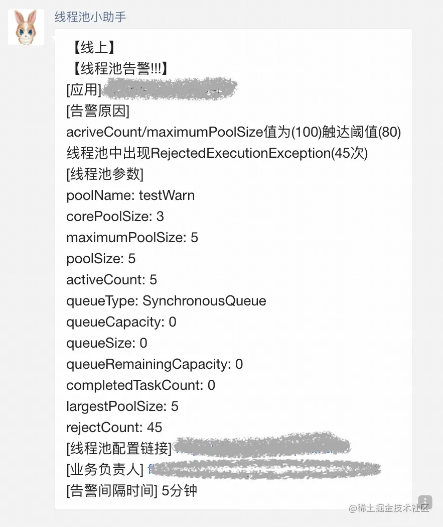 负载告警:线程池队列任务积压到一定值的时候会通过大象(美团内部通讯工具)告知应用开发负责人;当线程池负载数达到一定阈值的时候会通过大象告知应用开发负责人。