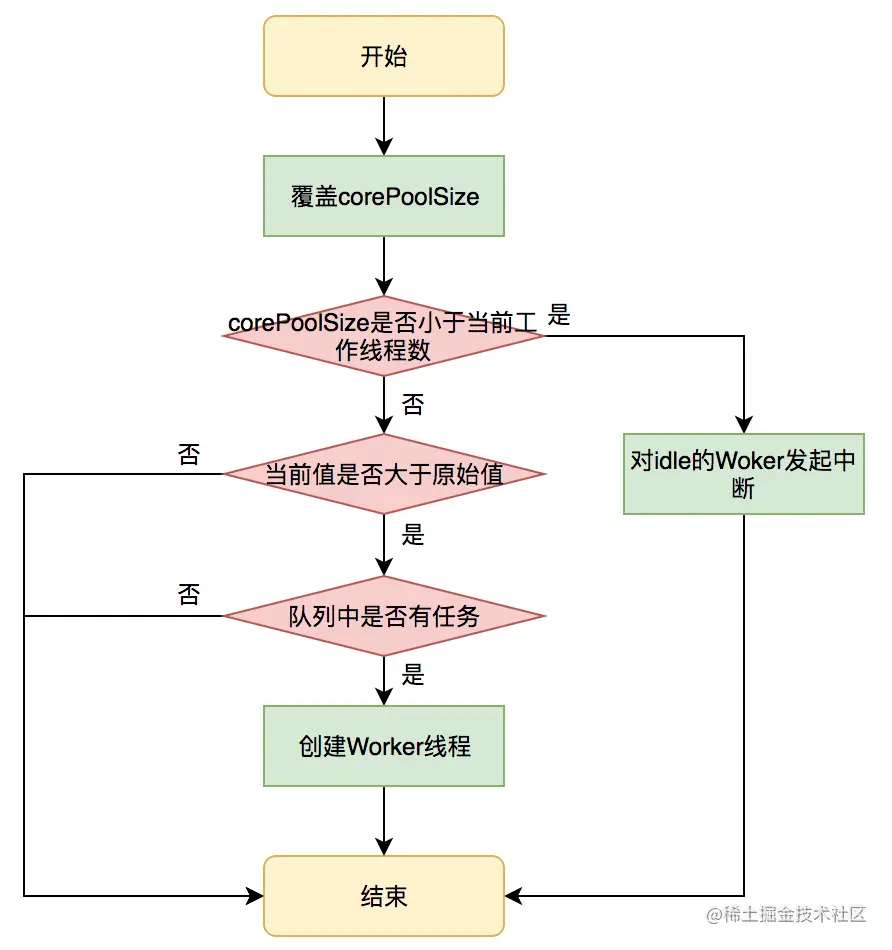 JDK允许线程池使用方通过ThreadPoolExecutor的实例来动态设置线程池的核心策略,以setCorePoolSize为方法例,在运行期线程池使用方调用此方法设置corePoolSize之后,线程池会直接覆盖原来的corePoolSize值,并且基于当前值和原始值的比较结果采取不同的处理策略。对于当前值小于当前工作线程数的情况,说明有多余的worker线程,此时会向当前idle的worker线程发起中断请求以实现回收,多余的worker在下次idel的时候也会被回收;对于当前值大于原始值且当前队列中有待执行任务,则线程池会创建新的worker线程来执行队列任务,setCorePoolSize具体流程如下: