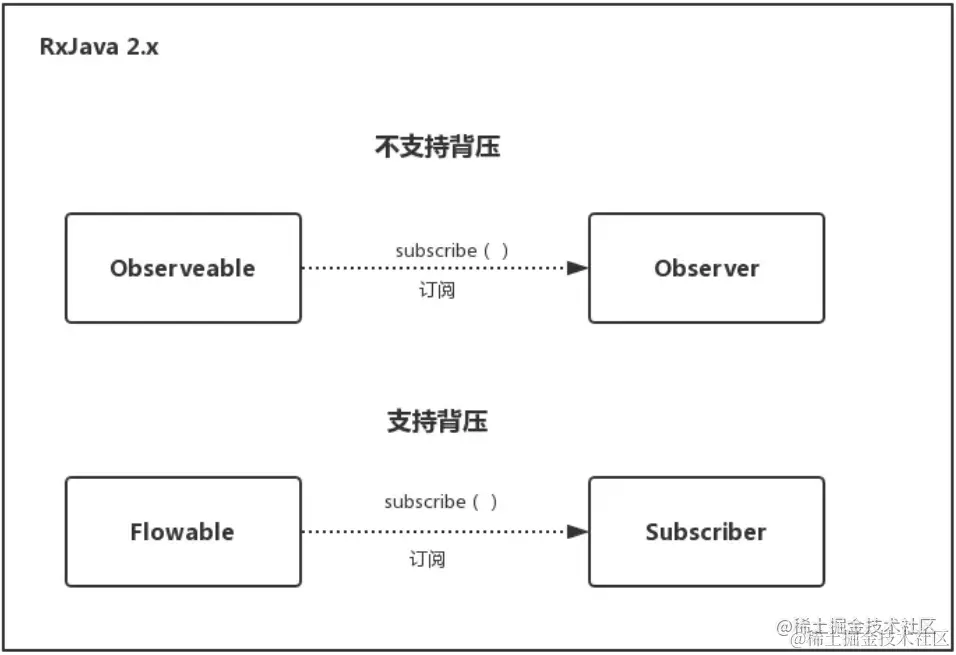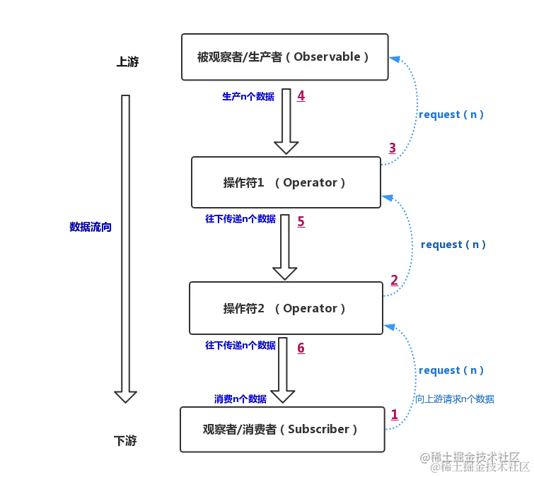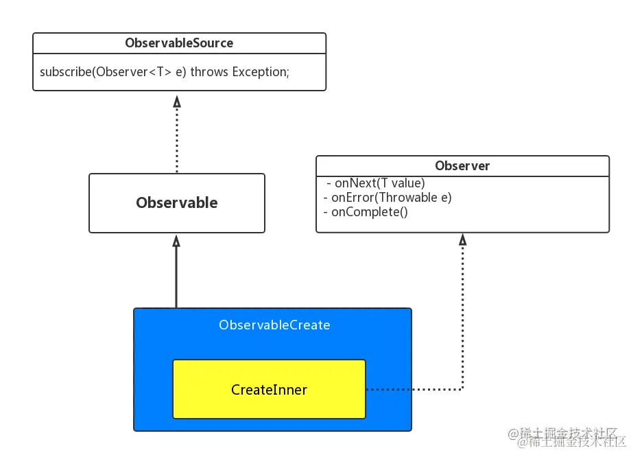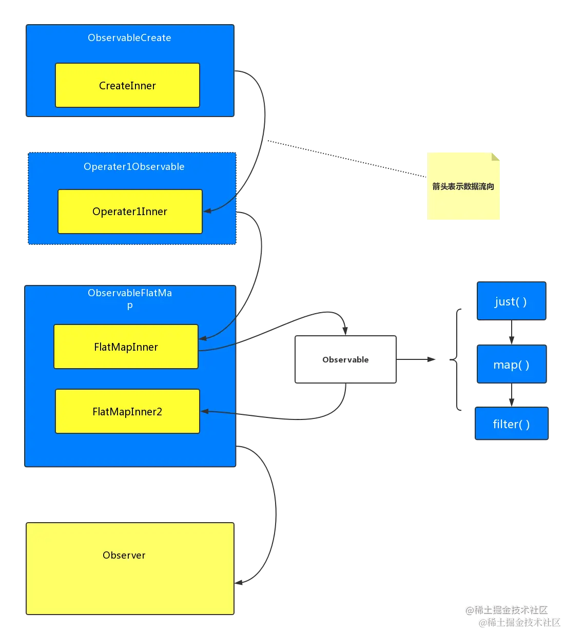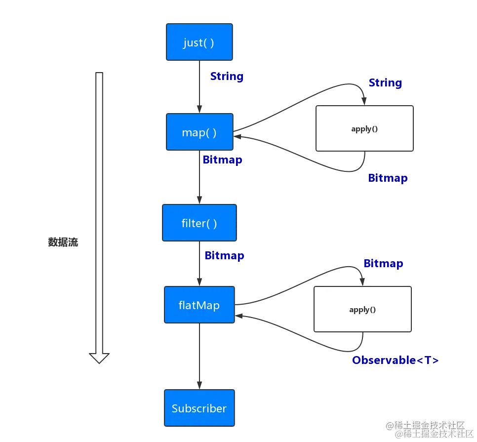 数据是通过 Observable 流向 Observer 的,那么想要实现整个调用链的数据流转,那么每个操作符只需要给上游操作符提供 Observer,并给下游提供一个 Observable,从而可以在整个调用链中发挥承上启下的作用。
