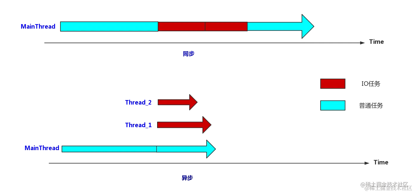 在同步执行时,当 CPU 执行到红色的 IO 任务时,直至 IO 任务完成,才继续执行接下来的普通任务;而在异步任务中,耗时操作在其他线程中,主线程不会被挂起。