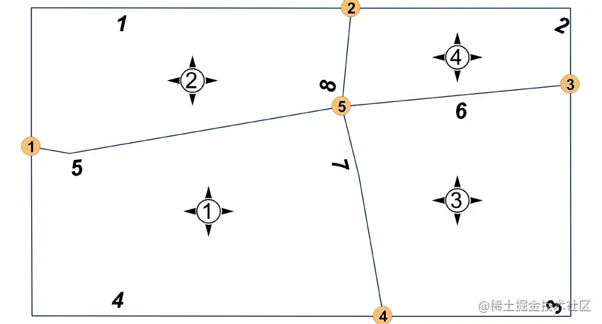 在这一点上,一张图会有帮助。我们使用QGIS PostGIS Topology Viewer制作了图2,其中显示了四个面的ID、八个边的ID和五个节点(每个节点使用不同风格的数字)。
