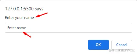 在上面的JavaScript代码中,我们调用了prompt()方法,要求用户输入他的名字。默认值将是Enter name。
