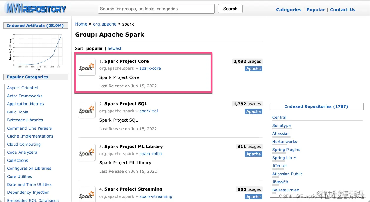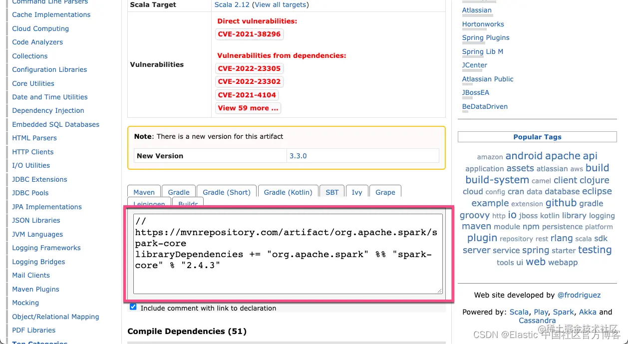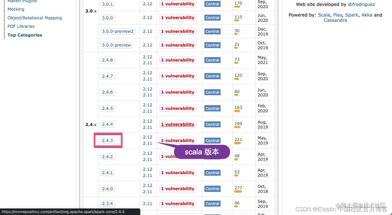 请注意上面的 2.11.12 scalaVersion。在上面,我们介绍了,elasticsearch-spark 在目前位置是使用 scala 2.11 版本来开发的。我们可以选择一个 Scala 的发行版本。我们需要使用到 spark-core 及 spark-sql 两个包。我们到地址 mvnrepository.com/artifact/or… 来进行查看: