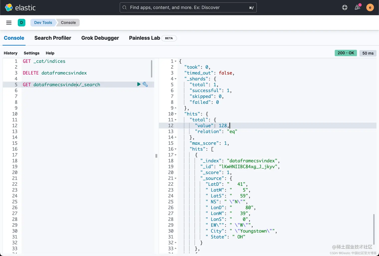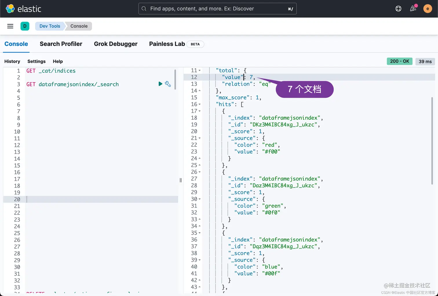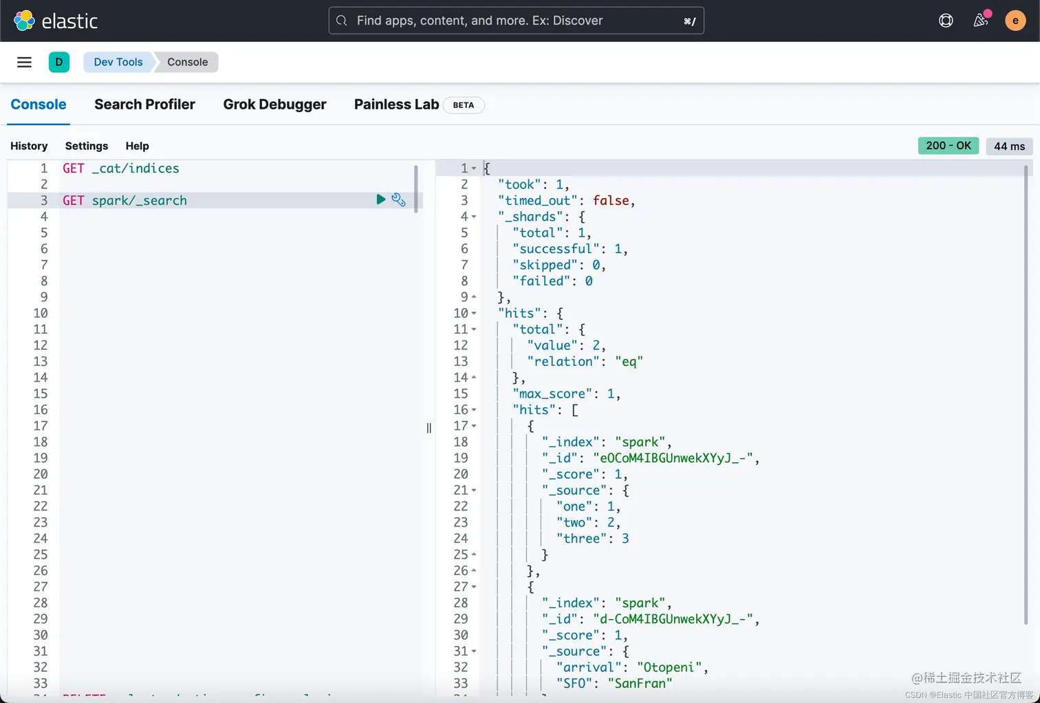 从上面的输出中我们可以看出来有两个文档已经成功地写入到 Elasticsearch 中了。