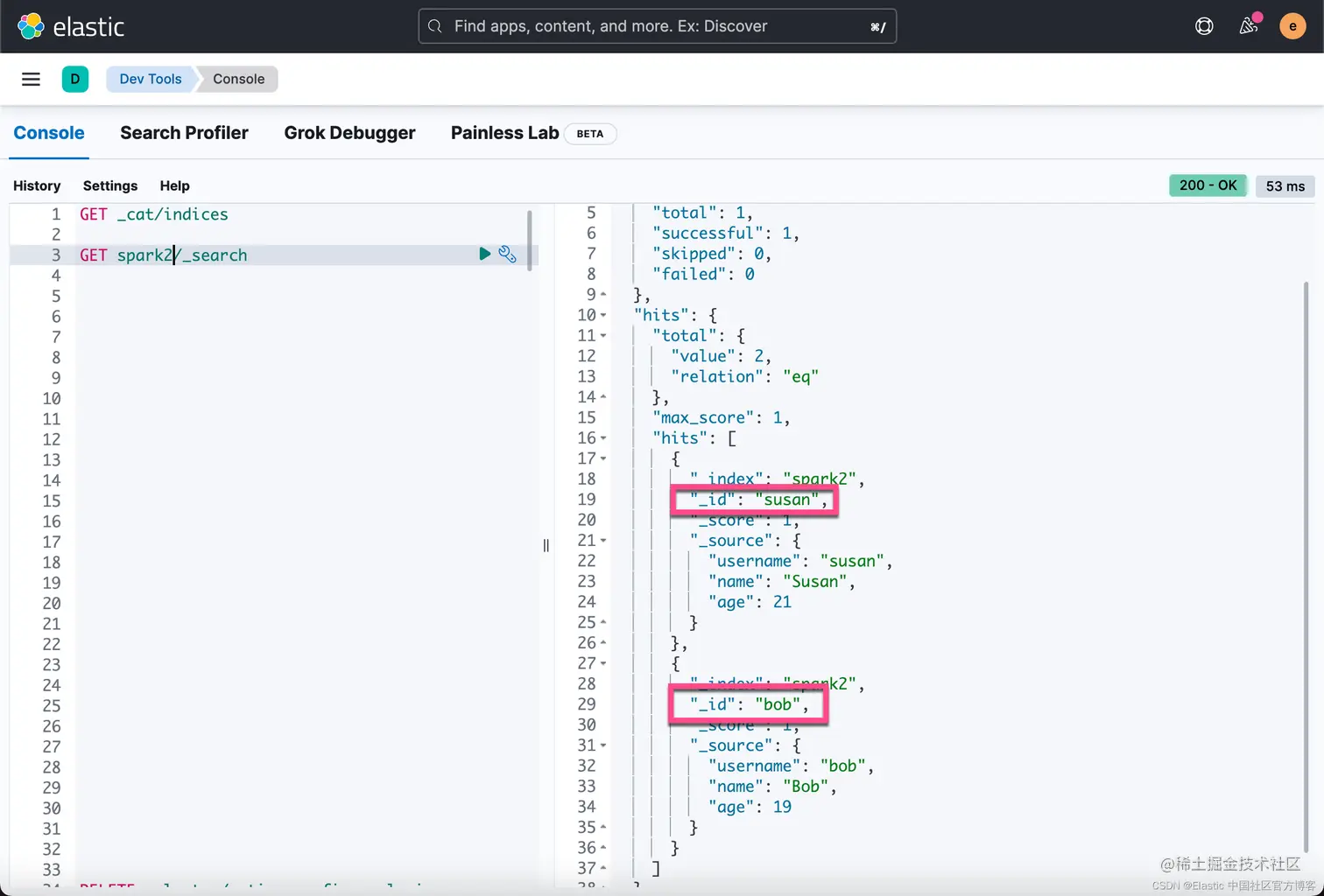 从上面的输出中,我们可以看到有两个文档被成功地写入到 Elasticsearch 中,并且它们的 id 是 Person 中的 username。