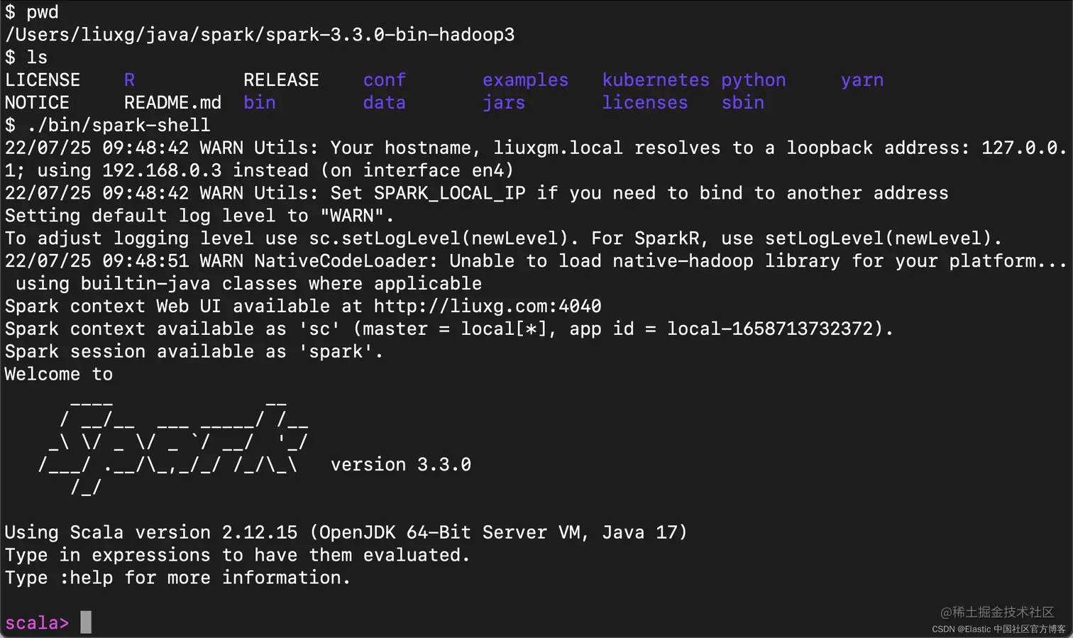 1)在 Spark 的根目录中,通过运行以下命令启动 Spark shell 以应用 Elasticsearch 配置: