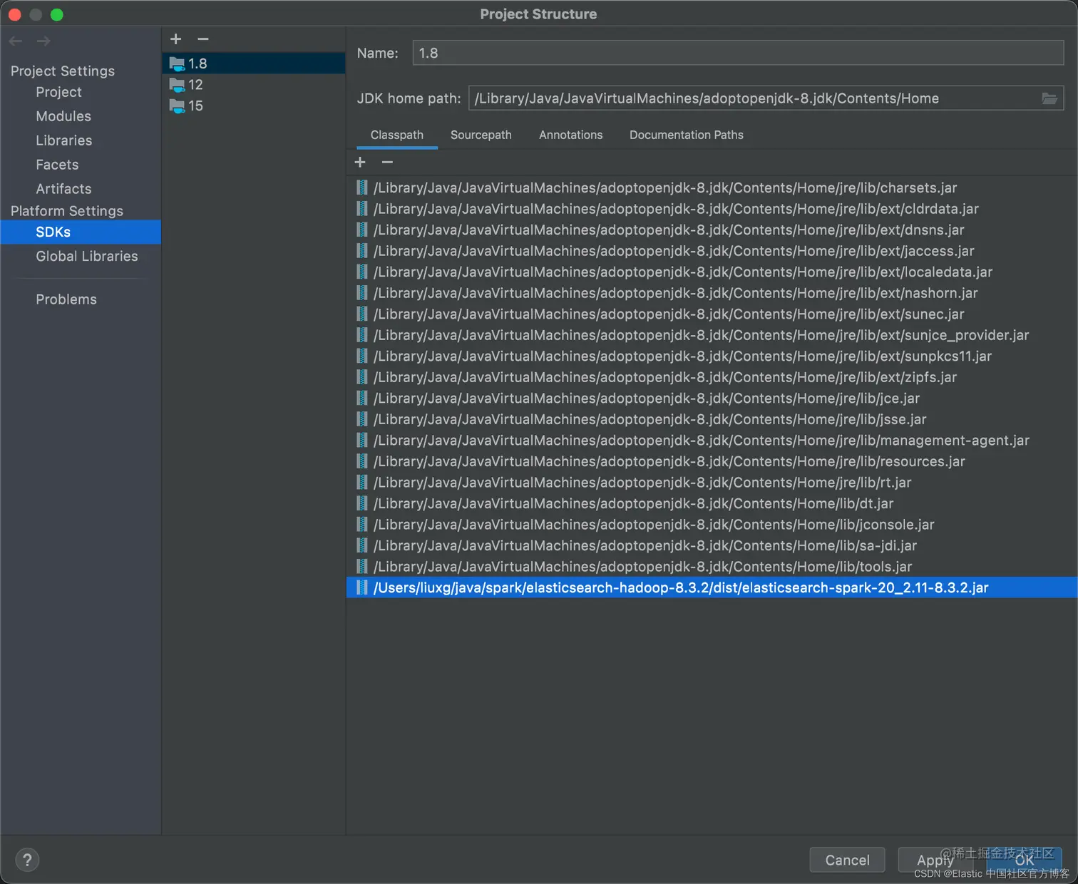为了能够访问 Elasticsearch,我们也可以在 IDE 中直接加载我们之前下载的 elasticsearch-spark-20_2.11-8.3.2.jar 安装包: