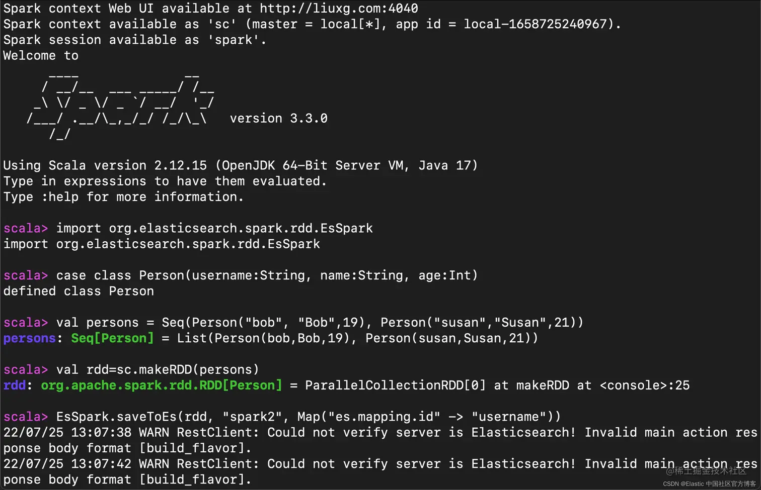 通过 Spark 在 Elasticsearch 中存储文档非常简单。 在 shell 上下文中启动 Spark shell 后,sc 变量可用,其中包含 SparkContext。 如果我们需要将值传递给底层 Elasticsearch 配置,我们需要在 Spark shell 命令行中进行设置。