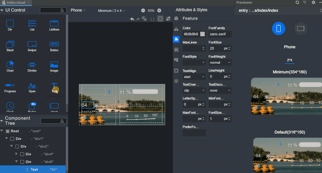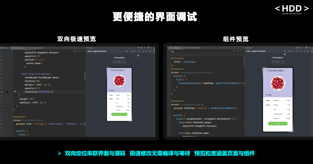 查看界面布局效果不方便?DevEco Studio提供多种预览功能,包括多端设备预览、双向预览、实时预览、动态预览等,让开发者可以在界面开发时快速查看界面布局效果。新版本的DevEco Studio还支持ArkUI声明式范式组件亚秒级同步刷新预览效果,预览粒度涵盖页面与组件。而且,双向预览通过代码编辑器、预览器UI界面和组件树(Component tree)三者之间的联动,可以双向定位界面与源码,实现快速修改代码和预览界面效果。