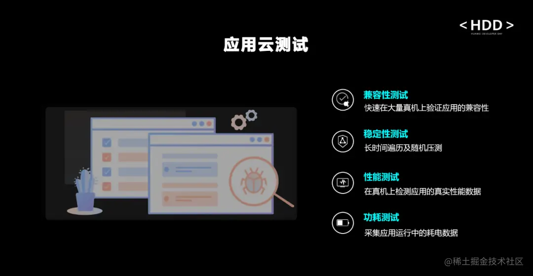 应用测试成本高、难度大?开发者服务中心的应用云测试服务提供丰富的真机设备资源,覆盖华为1+8智能设备,包括手机、平板、智慧屏、智能手表、运动手表等设备,可以很好地帮助开发者解决设备资源短缺、测试成本高昂等问题。应用云测试服务包括兼容性测试、稳定性测试、性能测试、功耗测试等,检测应用从安装、启动、运行和卸载的全生命周期中可能存在的问题,如应用崩溃、启动响应耗时长、前后台内存/CPU占用高、启动/卸载异常等,全方位检测应用质量。