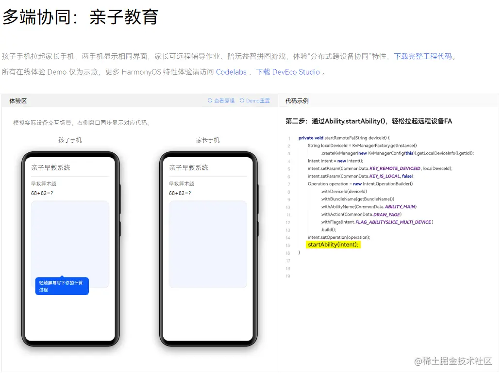 比如,图1展示了一个亲子教育的Demo。在左侧体验区,开发者可以操作孩子和家长的两台手机,体验HarmonyOS的多端协同特性;还可以下载完整工程代码参考学习。在体验Demo的同时,右侧的代码示例区会展示当前操作对应的代码和解析。