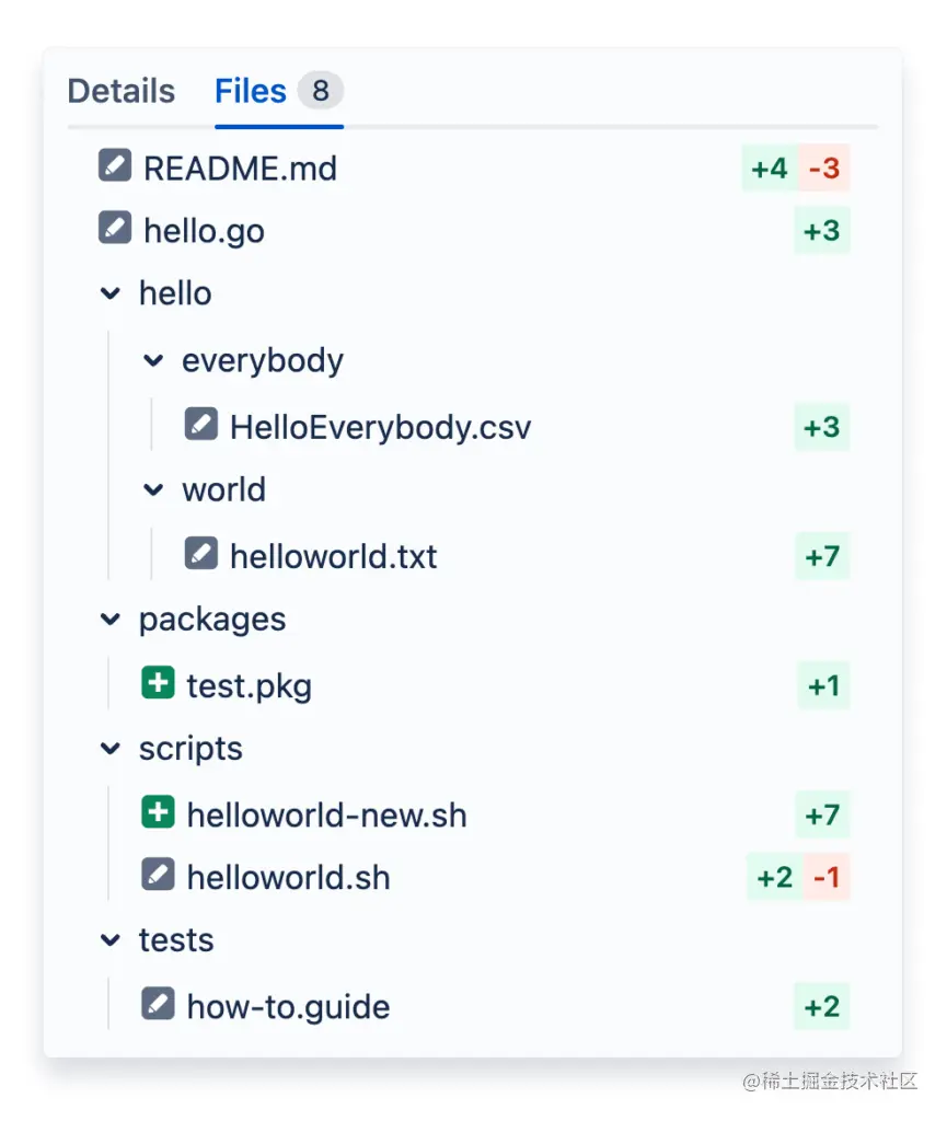右侧边栏的一个标签是改进的文件树,用于在差异中的不同文件之间进行导航。你可以看到每个文件的状态和每个文件中的差异数量。一目了然,你可以知道哪些文件有最多的变化,而不需要打开每个文件,现在,你可以在文件之间跳转,而不需要滚动到页面的顶部。