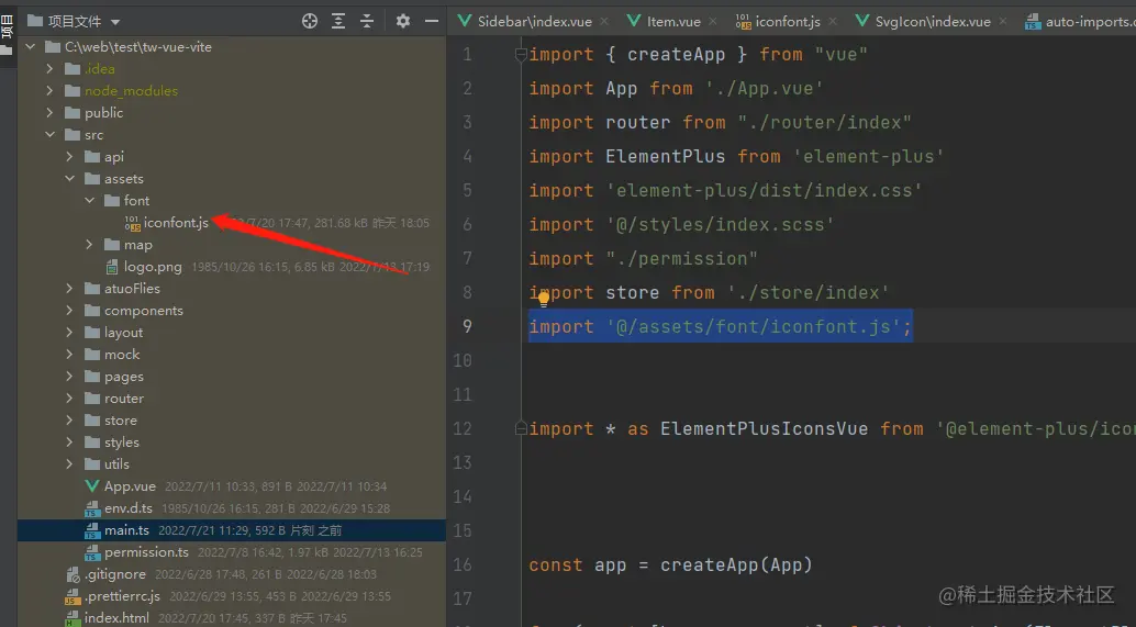 svg使用其实跟vue2的场景差不多,封装一个svg-icon组件,然后main.ts引入iconfont里面生成的文件js文件