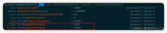 Java8 之后的版本,默认打开多层编译,使用命令 java -XX:+PrintFlagsFinal -version | grep CompileThreshold 查看。